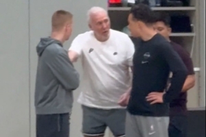 今日,馬刺傳奇教練波波維奇現身球隊訓練場,并在場上指導現任主帥米奇。