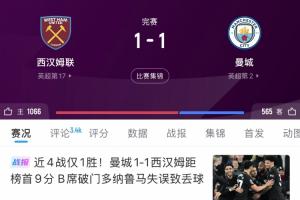 3月15日,曼城客場1-1戰平西漢姆聯,同輪阿森納2-0擊敗埃弗頓。曼城在少賽一場的情況下落后阿森納多達9分。